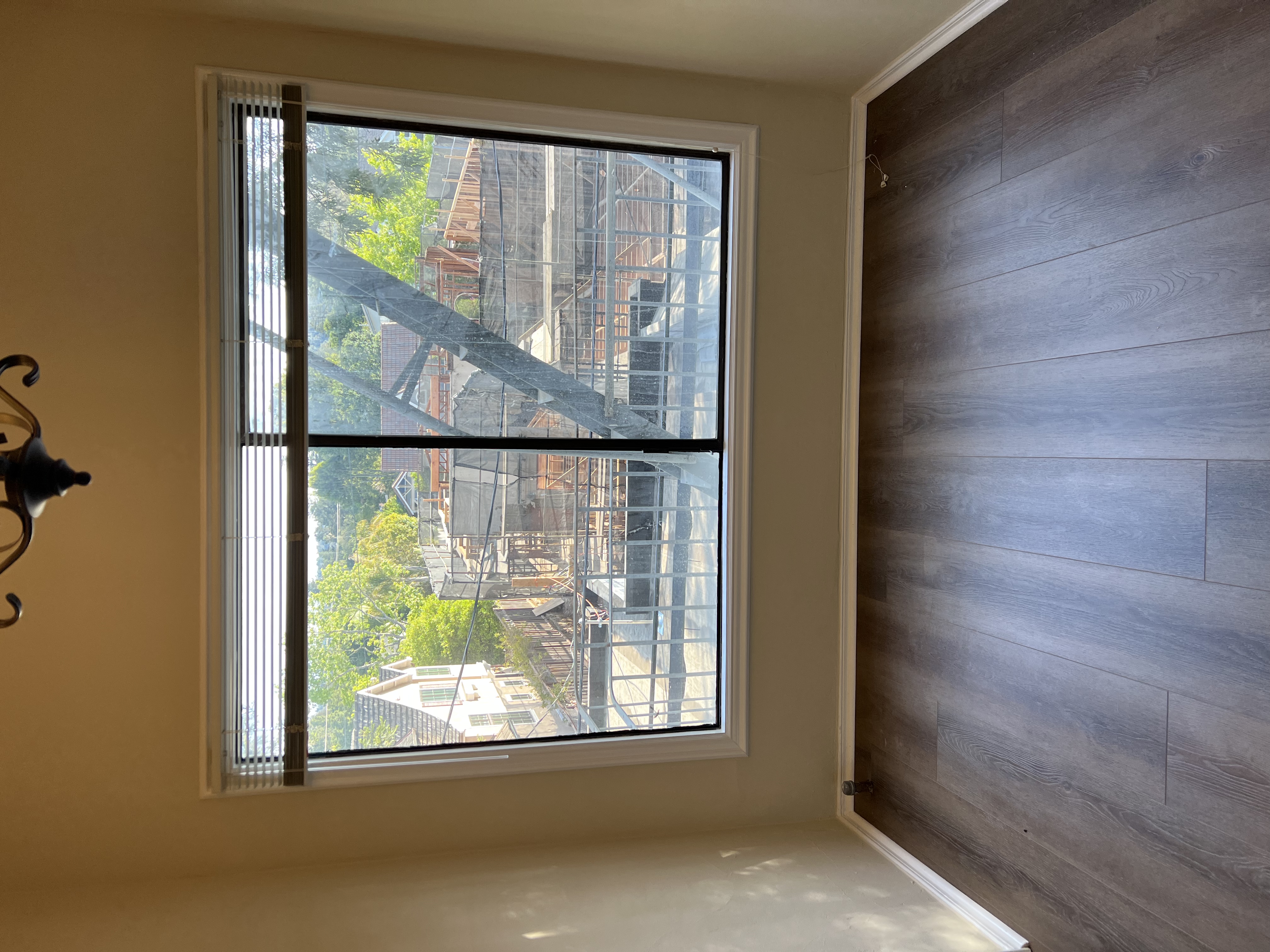 The unit is 750 square feet with one large walk in closet off the living room (sometimes used an a small office) and a smaller walk in closet in the bedroom. The unit faces the back of the building as opposed to El Camino Real.